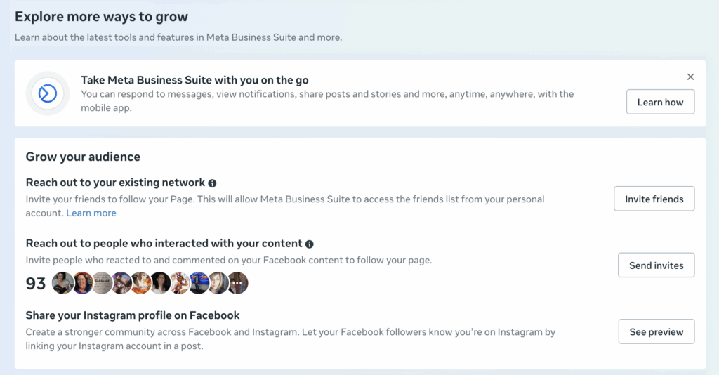 Scroll down to ‘Grow your audience’ under ‘Explore more ways to grow’.